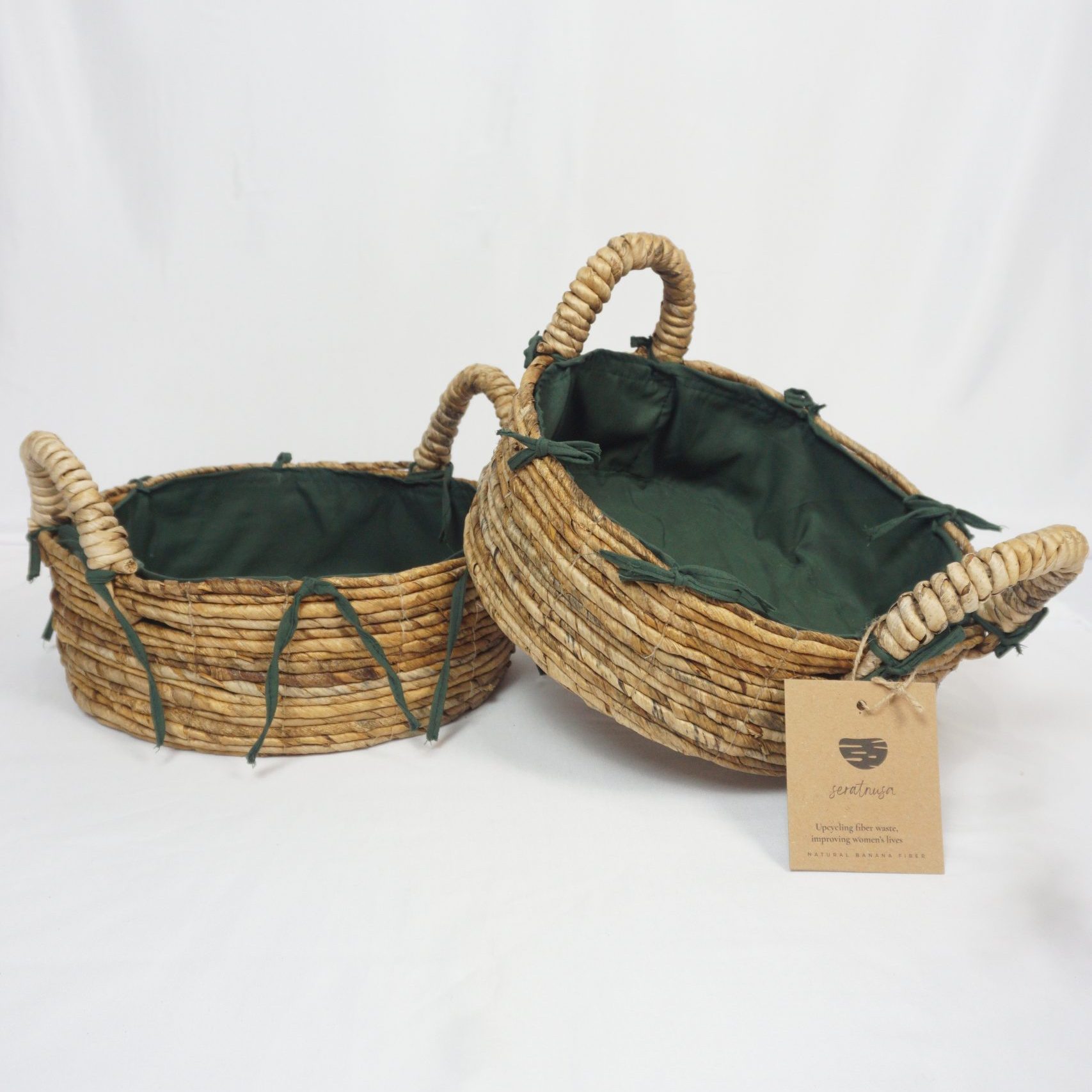 Wadah Asri memanfaatkan 10 pelepah pisang yang diproses kembali melalui prinsip circular economy. Setiap simpul anyaman dikerjakan oleh perempuan pengrajin, menciptakan keseimbangan antara fungsi dan estetika. Sebuah pernyataan bahwa keindahan dapat lahir dari pilihan yang bertanggung jawab.
